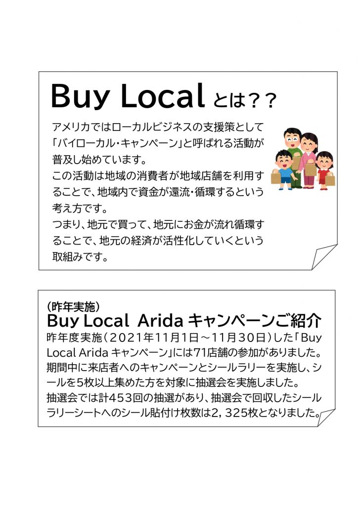「Buy Local 」とはの地元住民が地元店舗で買い物を積極的に行い、地域の経済を回そうという考え方です。これまで行ったことがなかった、最近あのお店へいけていないな、といった方への来店の❝きっかけづくり❞を促進し「Buy Local」に繋げることを目的とした「Buy Local Arida 2022」事業であり、下記の内容となっています。