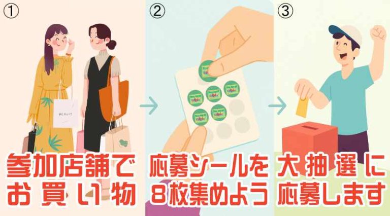 - バイローカルシールを8枚集めて、応募シートへ必要事項を記入し応募期間内に商工会議所窓口へ持参いただくか郵送にて応募ください。